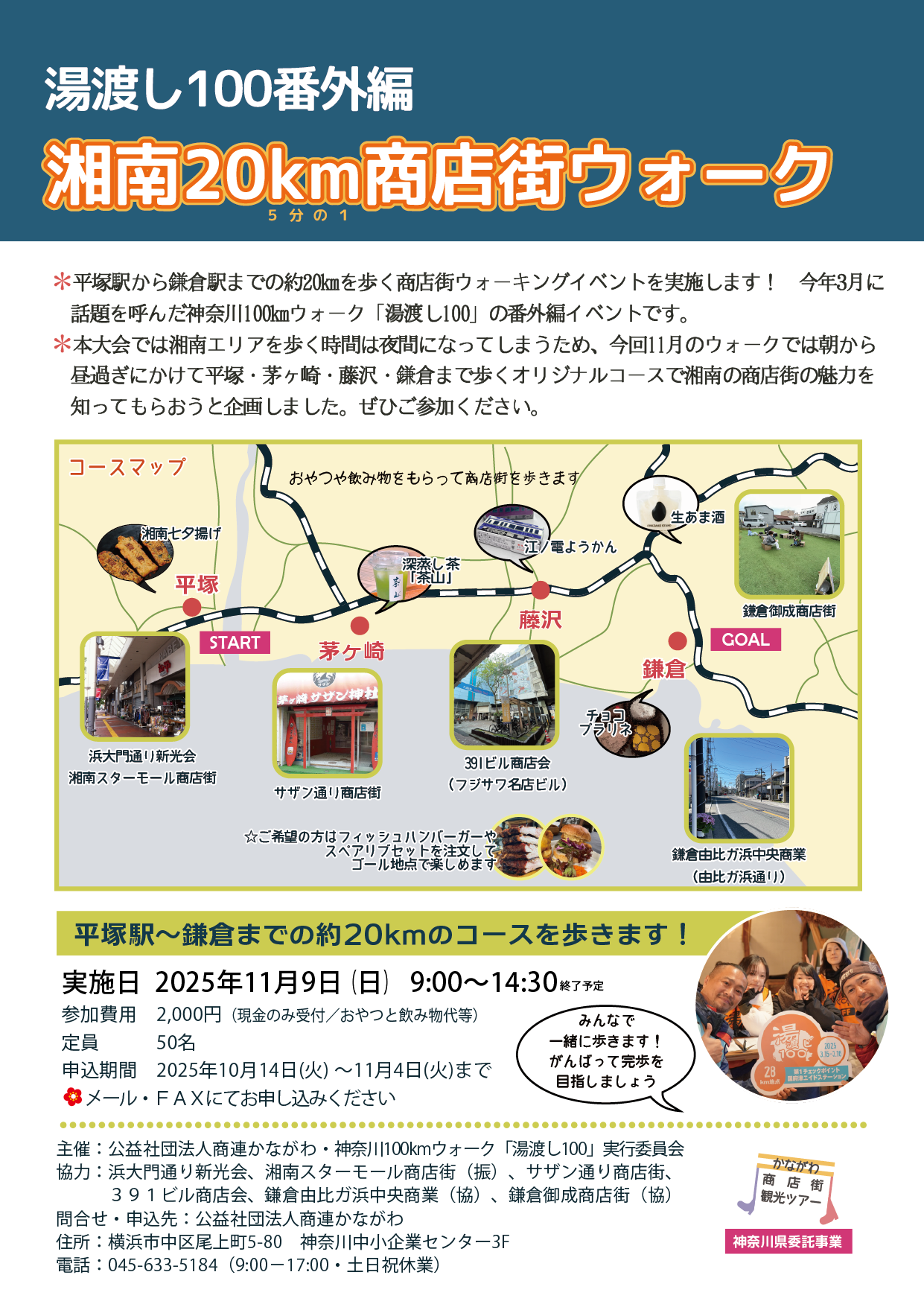 *平塚駅から鎌倉駅までの約20kmを歩く商店街ウォーキングイベントを実施します! 今年3月に話題を呼んだ神奈川100kmウォーク「湯渡し100」の番外編イベントです。おかげさまで“満員御礼!”…3月31日(火)